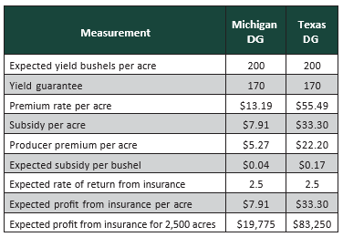 The current crop insurance design is based on a distance-based yield guarantee (DG) where subsidies are a percentage of premium rates. Comparing two hypothetical producers – one in Michigan and one in Texas – who both have a 200 bu./ac. expected yield with a 170 bu./ac. yield guarantee, but the Michigan producer has far less variability. Under a distance-based guarantee, the Texas producer receives more than four times the per acre subsidy.