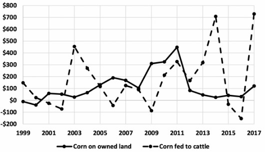One of the most striking features from this graph is that marketing corn through cattle results in returns that are greater over time but also more variable. Adding a feedlot enterprise increases the exposure to cattle market risk and weather risks outside the normal growing season. Including mechanisms to mitigate the downside risk either through risk management tools or by simply having more working capital available is critical to avoid crippling financial losses.