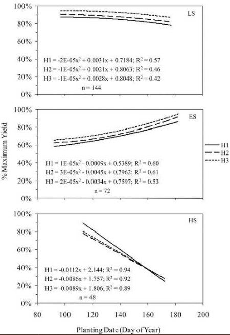 Figure 1. The top chart (LS, or Low Stress) shows how little corn yields changed as planting dates got later when growing conditions were good through the remainder of the season. The middle chart (ES, or Early Stress) shows that corn yields actually increased with later planting dates when conditions were too cool and wet early, but then became more favorable. The lower chart (HS, or High Stress) shows how dramatically corn yields decreased when conditions were favorable early in the season, but the mid-summer was hot and dry. H1 refers to the 100-day hybrid. H2 refers to the 108-day hybrid. H3 refers to the 112-day hybrid.