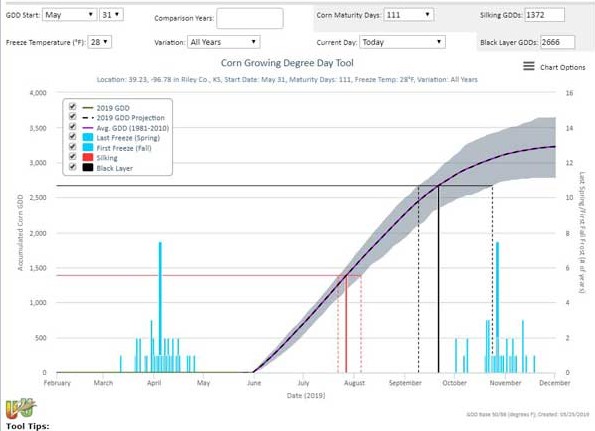 Figure 2. Corn growing degree day tool for a 111-CRM projected to be planted in May 31, 2019.