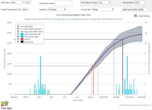 Figure 3. Corn growing degree day tool for a 111-CRM projected to be planted in June 15, 2019.