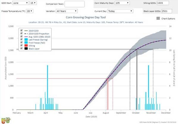 Figure 4. Corn growing degree day tool for a 105-CRM projected to be planted in June 15, 2019.
