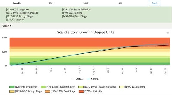 Below are examples of using this tool, looking at May 31 for planting date at a Scandia location. For this scenario, looking to the 2018 growing season, corn will reach maturity close from mid-to late October.