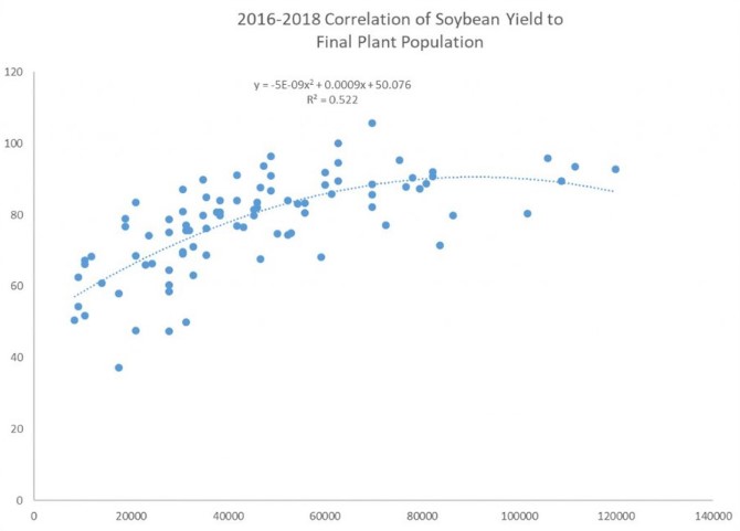 1. Soybeans have a tremendous capability to recover from reduced stands. Data from various states would indicate that near maximum yields are possible with stands at 100,000 plants per acre (PPA). At 70,000 PPA, yields will still be in the range of 90-95% of optimum. The PA On-Farm Soybean Network has studied the impact of reduced soybean stands over the past three years. The table below represents the impact of reduced populations on stands and supports replant decisions that if a uniform stand that is above the 80,000 PPA population yields will be maintained without replanting. The key in those plots were uniform stands.