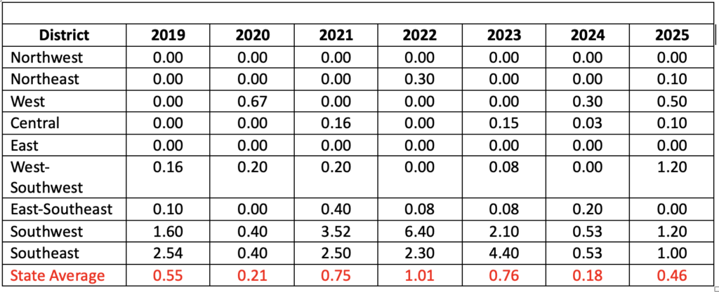 Dectes stem borer populations were consistently detected, particularly in south-central Illinois, where no-till and reduced-till soybean production are common. These systems create ideal conditions for the pest because undisturbed crop residue provides excellent overwintering habitat for larvae. Adult borers were first detected in late June (June 25 near Perry and June 26 near Ewing) and remained active through mid-July. This timing is crucial as farmers plan their scouting and management strategies.