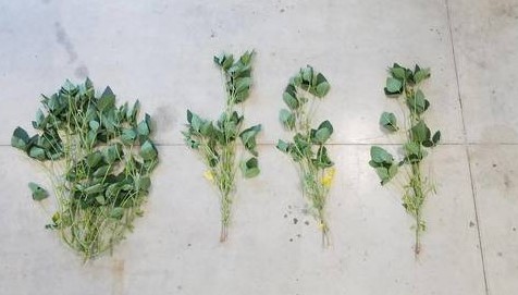 Figure 1. Soybean biomass accumulation at growth stage R2. Plants pictured (left to right) were seeded at 50,000, 90,000, 130,000 and 170,000 seeds per acre in Lansing, Michigan.