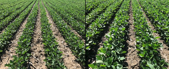 Figure 3. Soybeans seeded at 130,000 seeds A-1 with no fertilizer (left) and 12-40-0-10S-1Zn applied 2-in. below and 2-in. to the side of the seed at planting (right). Subsurface starter applicaions (2x2) may reduce risks associated with climatic variability by increasing early-season biomass accumulation and vegetative development.