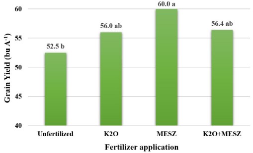 Plant growth and grain yield responses to K2O nutrient applications were not observed likely due to sufficient soil test K concentrations. Response to nutrient applications are less likely when soil test values are above critical levels. Increased grain yield (7.5 bu A-1), early-season growth, nutrient accumulation and canopy coverage were observed with MESZ applications. Despite grain yield differences, no profit differences were observed among fertilizer applications due both product and application costs.