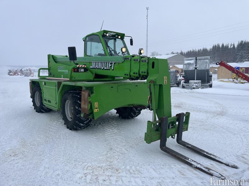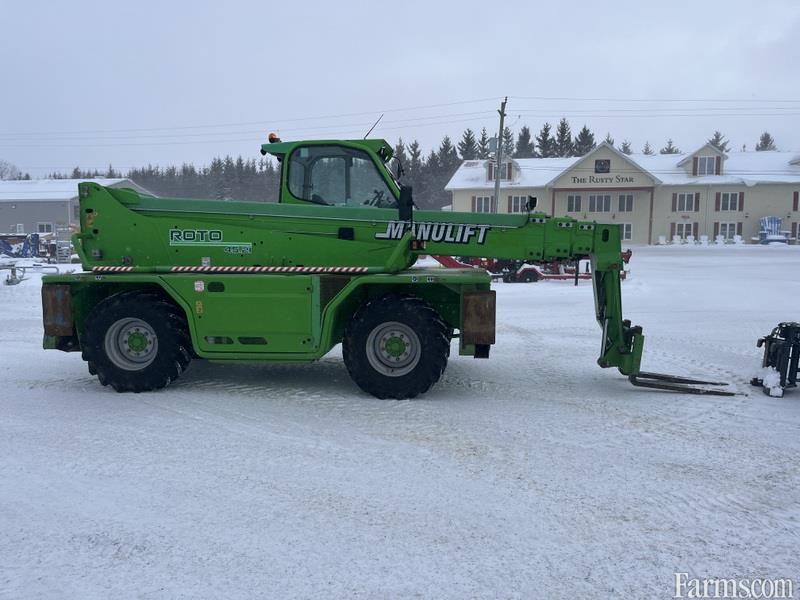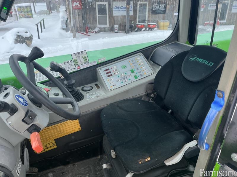 2016 Merlo 45.21 rotating zoom boom is powered by diesel engine. Equipped with forks, man basket and winch jib. Comes with remote. Equipped with hydraulic quick attach. Enclosed cab equipped with heat. Maximum lift capacity is 9900lbs and 68 feet of height reach. 2 speed transmission. Machine operating weight is about 33000lbs. 4 wheel drive with 2 wheel, 4 wheel and crab steering. Hour meter reads 3634. Located in Maxwell Ontario