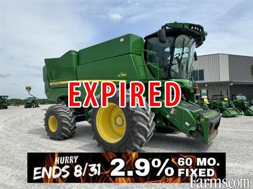 JOHN DEERE S780 STS CORN COMBINE, 2021, 2 speed POWER REAR WHEEL DRIVE, 13.5 LITER, 473HP, 523hp during unloading power boost, Premium cab, E/H header and separator controls, premium header controls, 3 position header height resume, dial-a-speed, cloth heated air suspension seat, cloth buddy seat, Climatrac automatic cab temp controls, premium AM/FM radio, refrigerator, camera ready (no cameras), electric adjust mirrors, 10" Gen4 color command center arm rest display w/ harvest monitor, 4600 processor, NO OTHER MONITORS, CommandCenter premium activation (auto-trac steering, RowSense, Section Control, turn automation, auto-path, machine sync, data sync & in field data sharing), JDLink premium MTG, LED lighting and extremity lights, REQUIRES AMS POSITION RECIVER WHICH IS "NOT" INCLUDED, single point electro/hydraulic coupler, ProDrive transmission w/Harvest smart, contour master command touch 5 speed feeder house w/reverser, 3.5" lift cylinders, dual lateral tilt cylinders, hydraulic fore & aft tilt, Dyna-flo plus Deep Tooth touch set chaffer and sieve, Combine Advisor package, ActiveYield plus moisture & yield sensors, active terrain adjustments, touch set, interactive combine adjustments, VisionTrak & engine speed management, Tristream extended wear rotor with extended wear round bar concaves, extended wear grain handling system, 400 bu grain tank, power folding tank covers, 26' high capacity extended wear unloading auger, grain tank mirror, wide spread 2 speed fine cut chopper, PowerCast tailboard with wind compensation & in cab control, track ready axle, Goodyear, LSW1100/45R46 R-1W flotation drive tires, Firestone, 750/65R26 R-1W steering tires.
