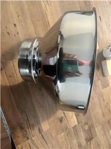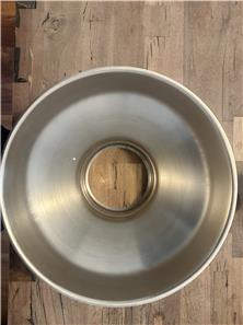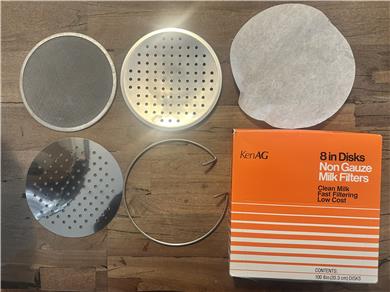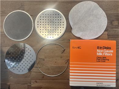 Stainless steel milk strainer. Dimensions are as follow: bottom dia. 6 1/2", top dia. 13 3/4", capacity: 3 gallon, filter size 8" and it fits on a large milk can and totes.