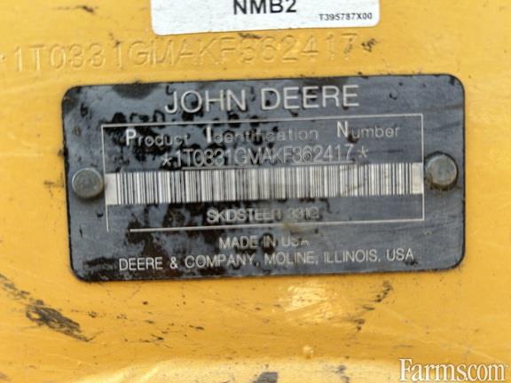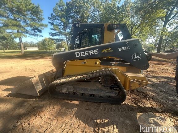 2019 John Deere 331G compact track loader, deluxe cab with ISO joystick and HIFLO, FT4 engine, wide zig-zag multi-bar tracks, high-flow hydraulics, self-leveling ride control, air-ride heated cloth seat, 3" seat belt with 2" shoulder strap, Power Quik-Tatch, cab with heat, defrost & air, deluxe lighting package, reversing fan, rearview camera, 110V cold start package, pre-cleaner, AM/FM Bluetooth radio, heavy-duty louvered rear grille, footrest with floormat, 84" heavy-duty construction bucket with edge.