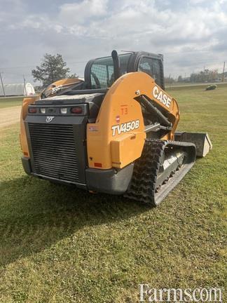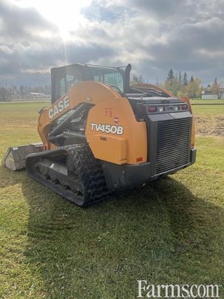 The Case TV450B is a powerful compact track loader featuring a 90-horsepower engine, 4,500 lb rated operating capacity (ROC), and a strong hydraulic system with Enhanced High Flow options delivering up to 35 GPM at 4,000 PSI. It boasts a 10,610 lb operating weight, high breakout force, and offers enhanced operator comfort, visibility, and serviceability.