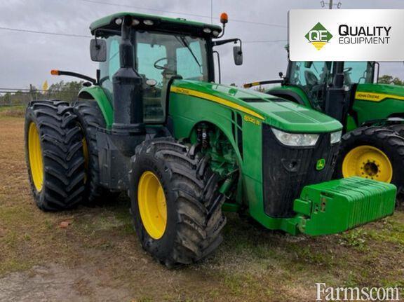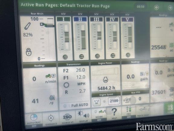 Cab: Cab, Rear PTO: 1000, Rear Tires: Duals, Tire Width: Wide, Transmission: IVT, Specifications: AutoPowr Infinitely Variable Transmission (IVT) 42 km/h (26 mph); 4600 CommandCenter; 4600 Processor; Standard CommandView III Cab; Premium Radio Package with XM Radio; Right-hand Reverser Linear-Type Transmission Controls; John Deere PowerTech 9.0 L (549 cu. in.) 6 Cylinder Tier 4/Stage V Compliant Diesel Engine; 227.1 L/min (60 gpm) Hydraulic Pump; Five Premium Rear Remote SCVs with Electrohydraulic (EH) Controls, Premium Couplers, and High Pressure Relief Levers; 45 mm (1-3/4 in.) 1,000 rpm (20-spline) PTO; 9,072 kg (20,000 lb) capacity 3-Point Hitch (Cat 4N/3) Hitch with Sway Blocks and Quik-Coupler; Category 4 adjustable Swinging Drawbar with 50 mm (2 in.) Pin; 120 mm (4.72 in.) diameter by 3010 mm (118.5 in.) length with Double Taper Wheel Hubs; 620/70R46 167A8 R1W Radial in Dual Wheel Configuration; ILS with hydraulic differential lock, fully-enclosed driveline and Group 48 Rear Tires; 600/70R30 152A8 R1W Radial in Single Wheel Configuration - Two Position; Standard Lighting; Ethernet Switch; Weight, front support with twenty-two suitcase weights; One Pair 625 kg (1378 lb); One Pair 72 kg (159 lb) Starter Weights and One Pair 205 kg (452 lb) Weights for Outer Rear Dual;