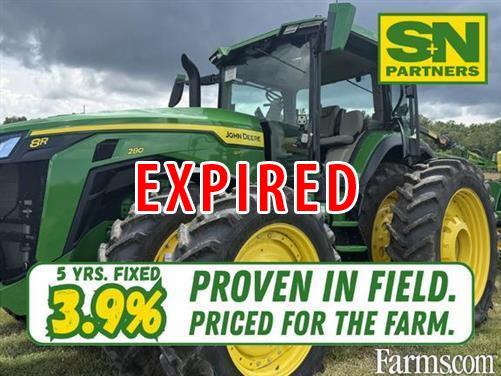 JOHN DEERE 8R 280 MFWD, CAB TRACTOR, 2024, 280hp, 9 LITER, 6 cylinder diesel engine, JDLink MTG, 16F/5R powershift transmission (25 mph), right hand reverser w/ bump to shift controls, Premium cab with cab suspension, HVAC, premium comfort and convenience pkg, electric adjust mirrors, premium cloth air seat, cloth folding buddy seat, touch screen AM/FM radio, LED beacon lights, business radio ready, refrigerator, ultimate visibility upgraded LED lighting, integrated digital camera, dual beam radar sensor, load sensing hydraulic power steering, dual G5 Plus CommandCenter 12.8" display with permanent licenses for AutoTrac steering, Section Control, Data Sync, Over Air updates & Remote Display Access, renewable SF-RTK 3 year license for Implement Guidance, Turn Automation, AutoPath, Data Share & Machine Sync, includes integrated Starfire SF-1 global position receiver (accuracy subscriptions required), rear implement ethernet, 84 GPM dual hydraulic pump, 5 rear remote hydraulic valves with ISO couplers and high pressure relief levers, auxiliary case drain coupler, power beyond pressure coupler, load sense coupler,